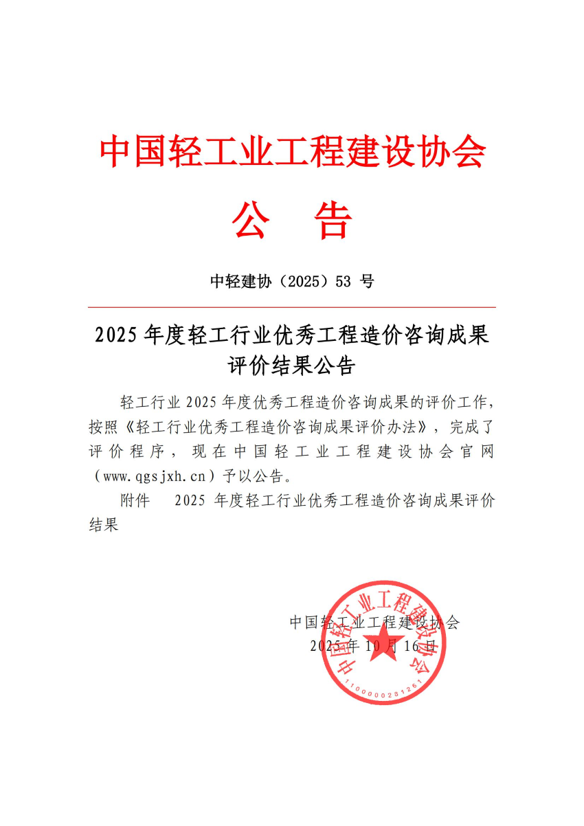 • 2025年度轻工行业优秀工程造价咨询成果 评价结果公告